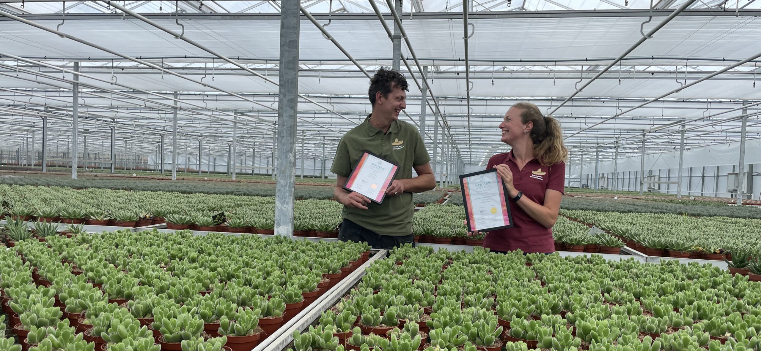 De awards zijn inmiddels bij ons in de kas gearriveerd. Natuurlijk moesten we dat even vastleggen. Tussen de rijen planten in wording poseren twee trotse helpers erbij met de gewonnen prijzen.